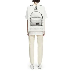 The Eastpak X Maison Margiela Poster Bag features a black and white Eastpak backpack printed graphic and black text describing the MM6 X Eastpak SS22 collection