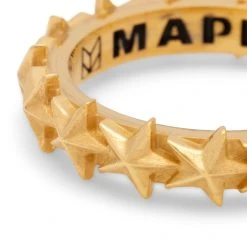 Silver 925 base with 14K gold dip finish. The Star Ring features a 3D star pattern band. Black tinting accents the polished silver to give the ring depth. Hallmarking and MAPLE logo inside.