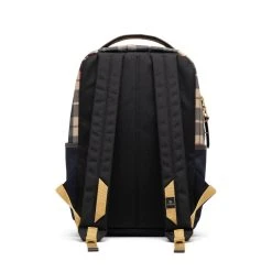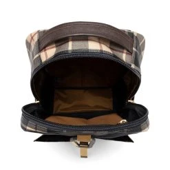 The main body fabric is based on a high-density cotton tartan check dyed-yarn fabric. 0.3 mm thick PVC processing for high durability. High waterproof performance. In addition, the multi-coloured plaid is also toned down by P.V.C processing to express calm colour. The attached fabric is made of nylon twill with special processing. The warp yarn is 210d and the weft yarn is 420d, with special processing to compress it and to make it more dense and firm.