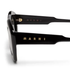LAUGHING WATERS sunglasses. Geometric acetate frame. Tinted cridal lenses. Thick temples with curved tips. Gold-tone Marni logo. Internal red lettering. Handmade in Italy.